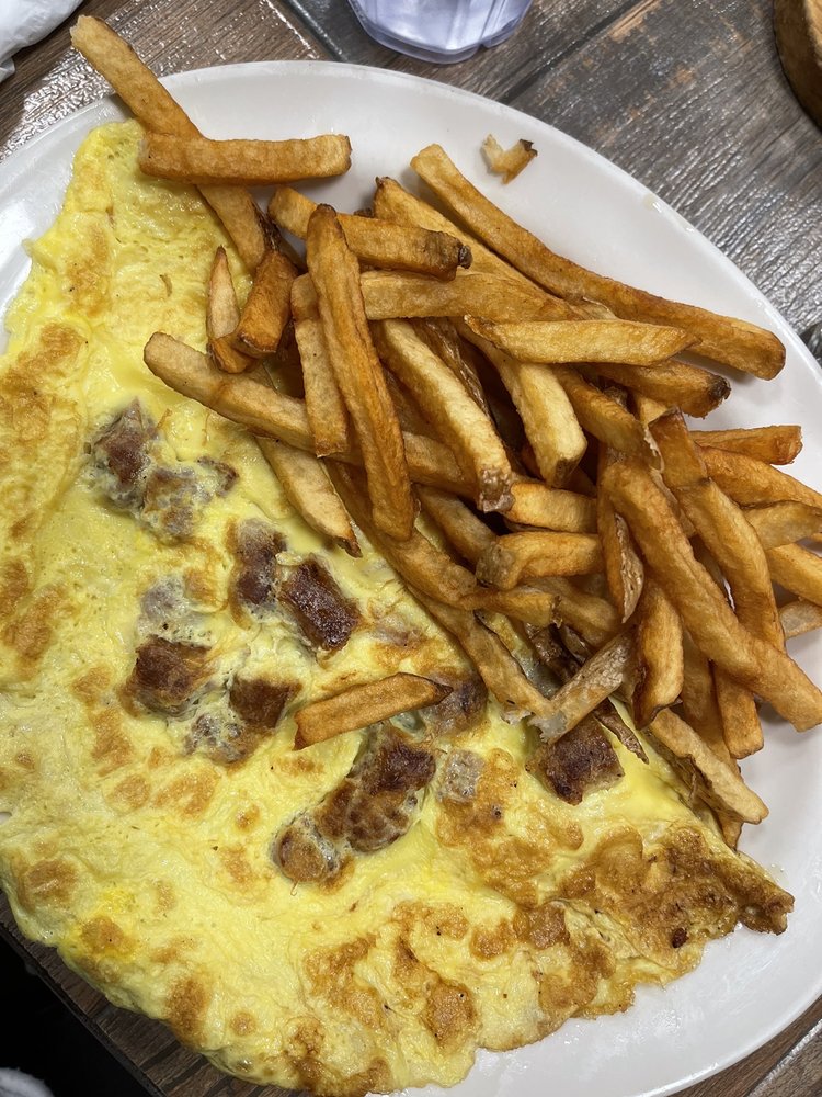 Pancakes, waffles, or French toast. Bacon, ham, or sausage. Served with two eggs any style and fries.