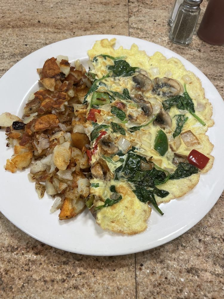 Fresh spinach, tomatoes, mushrooms, peppers, and onions. Plates are served with toast, home fries, or French fries.