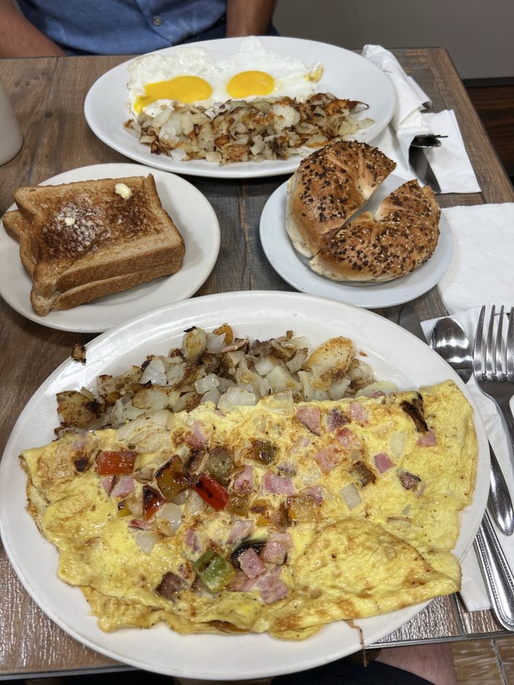 Peppers, onions, and ham. Plates are served with toast, home fries, or French fries.